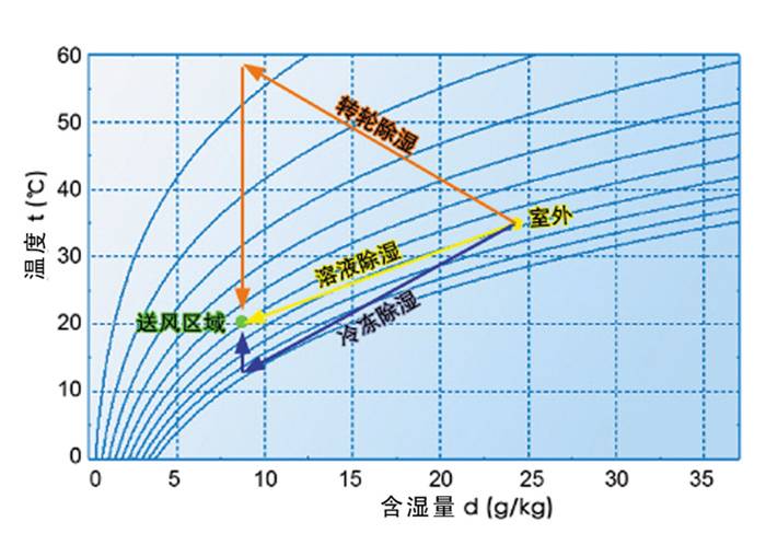 溫濕度獨立調節(jié)的空調系統(tǒng)的核心在于新風處理,目前可用的新風除濕方式有三:冷凍除濕、轉輪除濕和溶液除濕。其中,傳統(tǒng)的冷凍除濕(7/12℃冷凍水或直接蒸發(fā))應用廣泛,但能效比低(綜合COP2.5~3.3),同時存在濕表面(表冷器)對空氣的二次污染問題。轉輪除濕是一種用作空氣深度除濕處理的專用設備,用作新風除濕處理時,不但能效比低(綜合COP小于2.0),而且需要前、后冷卻裝置及高溫熱源的輔助。相比于前兩者,溶液除濕是一種最為理想的新風處理方式,其系統(tǒng)綜合COP可高達5.0以上,不但可以有效解決濕表面污染問題,還具有顯著的殺菌功效,冬季則可以同時解決新風加濕問題。
